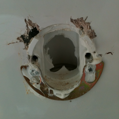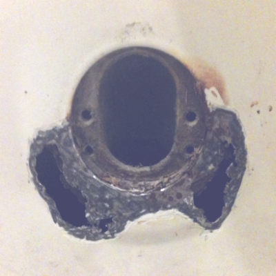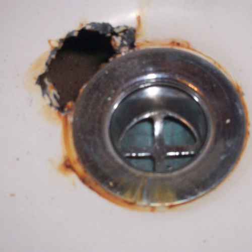 Both steel and fiberglass bathtubs are subject to degradation of the drain or overflow. In a fiberglass tub cracks can develop from the tub flexing against the anchored drain pipe; water wicks into the very thin cracks through capillary action and the degrading process begins. To repair it, the damaged area is removed, the surrounding area is cleaned, epoxy-glassed, sculpted, faired and top coated.